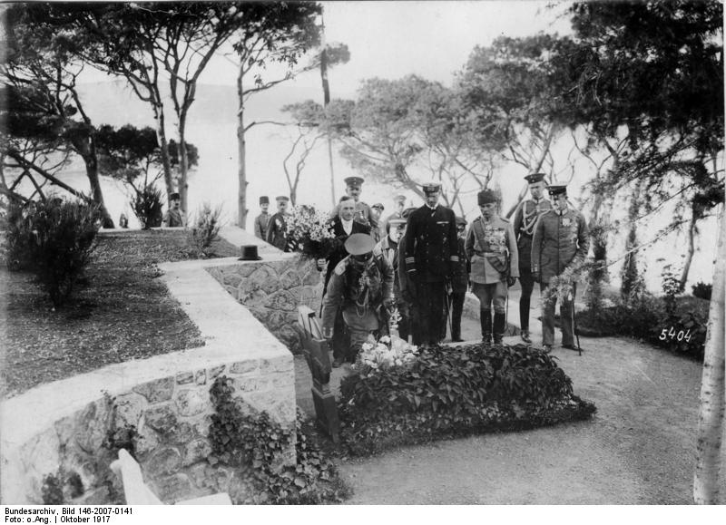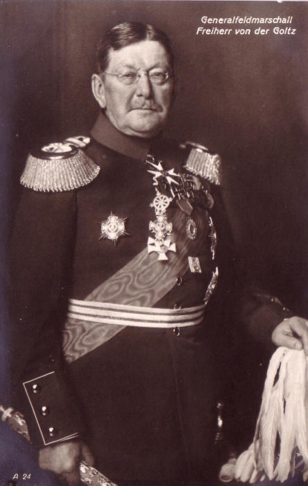 [0a] Also called the German “Orient group”, or the “Pasha Army” (see above, note 9), referring to von der Goltz “Pasha”. Wilhelm Leopold Colmar Freiherr von der Goltz (1843–1916) was a Prussian field marshal and military writer. Von der Goltz served in the Prussian infantry as a second lieutenant from 1861 to 1866, later in the general staff, where he also took part in the battles of Vionville and Gravelotte and in the siege of Metz. Since 1871, he was professor at the military school at Potsdam in 1871, promoted to captain, and placed in the historical section of the general staff. It was then that he wrote several memoirs that acquired the status of handbooks of military strategy and psychology (focusing, among other things, on the mobilisation of national will for a Volkskrieg ”War of the People”, later developed further into the idea of Das Volk in Waffen “The nation in arms” where the state would seek to mobilize the entire nation and its resources for war, what today might be called total war). In order to “lead military organization to ever greater perfection […] Goltz thought society needed to be militarized in peacetime on an unprecedented level, and what was required was ‘the full amalgamation of military and civilian life.’ Goltz was a militarist, Social Darwinist and ultra-nationalist who believed war was necessary, desirable and inevitable. In Goltz’s Social Darwinist perspective, just as ‘survival of the fittest’ prevailed in nature, the same principle applied to international relations with ‘strong’ nations rightfully devouring ‘weak’ nations. Goltz, who saw the carnage of war as the most beautiful thing in the world wrote: ‘It [war] is an expression of the energy and self-respect which a nation possesses…. Perpetual peace means perpetual death!’” / After the Ottomans’ defeat in the Russo-Turkish War (1877–1878), von der Goltz served for twelve years as a military advisor to the Sultan Abdülhamid II, helping to reorganize the Ottoman Army. / “Goltz achieved some reforms, such as lengthening the period of study at military schools and adding new curricula for staff courses at the War College. From 1883 to 1895, Goltz trained the so-called ‘Goltz generation’ of Ottoman officers, many of whom would go to play prominent roles in Ottoman military and political life. Goltz, who learned to speak fluent Turkish, was a much admired teacher, regarded as a ‘father figure’ by the cadets, who saw him as ‘an inspiration’. […] As a result, it was the Ottoman army rather the German army which first embraced Goltz’s ‘nation in arms’ theory as the basis of its understanding of war. After some years he was given the title Pasha.” / On his return to Germany in 1895 Goltz served in several leading positions, continuing also his career as a military writer. / “Goltz welcomed the Young Turk Revolution of 1908, which should come as no surprise given that most of the officers leading the revolution were men he had personally trained. […] / Following the 1911 manœuvres Goltz was promoted to Generalfeldmarschall (Field Marshal), and retired from active service in 1913.” When WW I broke out, however, he was soon recalled from retirement and first (1914–1915) served as military governor of Belgium, then (1915–1916) again in the Ottoman Empire, since mid-October 1915 in charge of the Sixth Army (to lead the “Mesopotamian campaign”). / “Goltz died on 19 April 1916 […] The official reason for his death was typhus, although apparently there were rumors that he had been poisoned. In accordance with his will, he was buried in the grounds of the German Consulate in Tarabya, Istanbul, overlooking the Bosporus [see Fig. 12]” – https://en.wikipedia.org/wiki/Colmar_Freiherr_von_der_Goltz (as of May 14, 2024).