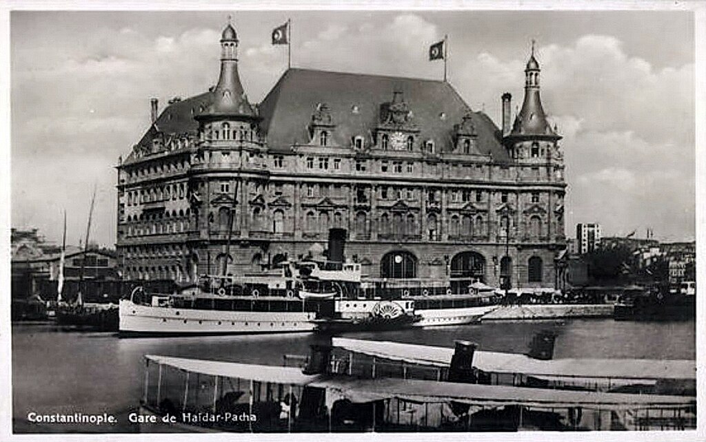 [20] Modern Turkish spelling: Haydarpaşa. The station was built in 1871 by order of Sultan ʿAbdülʿazīz and saw its first regular passenger service (daily train from/to İzmit) in 1890. “Since the station was built right beside the Bosphorus, freight trains could unload at Haydarpaşa and the freight could be transferred straight to ships. […] Haydarpaşa was chosen as the northern terminus for the Baghdad Railway [see below, note 87] and the Hejaz Railway [see note 88] in 1904, and, with rail traffic increasing, a larger building was required. The Anatolian Railway hired two German architects, Otto Ritter and Helmut Conu, to build the new building. They chose a Neo-classical design and construction started in 1906. […] German and Italian stonemasons crafted the decoration of the exterior. The work was completed on land reclaimed from the sea on 19 August 1909 and the new terminal was inaugurated on 4 November 1909 for the birthday of Mehmed V. While the work was in progress the community of German engineers and craftsmen established a small German neighbourhood with its own school in the Yeldeğirmeni quarter of Kadıköy. [… – Towards the end of WW I] Haydarpaşa fell under British military control during the occupation [see below, p. 251 with fn. 221 as well as Fig. 24 and Fig. 25]” – https://en.wikipedia.org/wiki/Haydarpaşa_railway_station (as of March 21, 2024).