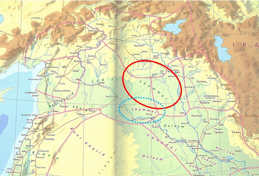 [14] I.e., the Shammar, “a tribal […] confederation, descended from the Ṭayy, which migrated into the northern Arabian Peninsula from Yemen in the second century. It is the largest branch of the Ṭayy, and one of the largest and most influential Arab tribes. The historical and traditional seat of the tribe’s leadership is in the city of Ḥāʾil in what was the Emirate of Jabal Shammar in what is now Saudi Arabia. In its ‘golden age’, around 1850, the Shammar ruled much of central and northern Arabia from Riyadh to the frontiers of Syria and the vast area of Upper Mesopotamia […]. / One of the early famous figures from the tribe was the legendary Ḥātim al-Ṭāʾī (Hatim of Tayy; died 578), a Christian Arab renowned for generosity and hospitality who figured in the One Thousand and One Nights. […] / […] some sections of Ṭayy, and most of the Ghassanids and Lakhmids, were present in Mesopotamia and the Levant prior to Muḥammad’s preaching of Islam in the early 7th century. […] / […] the Ṭayy invaded […] northern Arabia in their exodus from Yemen in 115 CE. […] The Ṭayy became nomadic camel-herders and horse-breeders in northern Najd for centuries. Because of their strength and blood relations with the Yemenite dynasties that came to rule Syria (the Ghassānids) and Iraq (the Lakhmids), the Ṭayy expanded north into Iraq all the way to the capital at the time, al-Ḥīrah. The area of the two mountains subsequently came to be known as Jabal Shammar (Shammar’s Mountain) from the 14th century, the first time that the Shammar as a tribe were noted in literature. […] / The Shammar is Iraq’s largest Arab tribe […], with [today] more than 1.5 million members. […]” – https://en.wikipedia.org/wiki/Shammar (as of March 25, 2024; most transliteration signs added by myself, S.G.).
