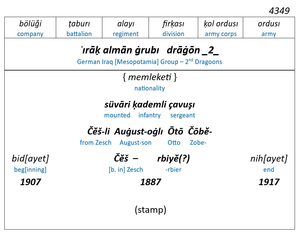 – Moreover, the start (bid[āyet]) of his service in the “German Iraq group – 2nd Dragoons” (ʿırāḳ almān ġrubı – drāġōn 2) is given as “1907”, i.e., long before the outbreak of WW I and the beginning of the German-Ottoman alliance. Perhaps, it is meant to indicate the beginning of Otto’s service in the 2nd Dragoon regiment of Schwedt (see biography), but if so, it is still not correct (as his service there lasted from 1905 to 1908). – Forth, while the beginning-and-end years are given according to the Christian calender, the war in which Otto shall have demonstrated “good service”, is given according to the Islamic calendar: the “1332–33 war”. – Fifth, which war could that be? The Islamic year 1332 AH started in December 1913 CE, and 1333 AH ended in October 1915 CE. Given that Zoberbier’s service in the Ottoman Empire did not start earlier than with his arrival in İstanbul in December 1915, and that he was still working at his post office between 1908 and the outbreak of the war, there is no overlapping between the dates given in the “war medal” and those of the actual biography (as remembered by his son Werner)