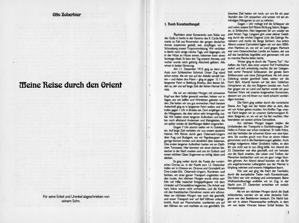Neben der vorliegenden Einleitung enthält diese Website drei – und indirekt vielleicht sogar vier – Fassungen eines Textes: der Kriegserinnerungen des Wachtmeisters Otto Zoberbier, eines deutschen Unteroffiziers, der während des Ersten Weltkriegs seinen Militärdienst in Mesopotamien im Rahmen des deutschen Asien‑Korps vom Dezember 1915 bis März 1919 leistete. Wir wissen nicht, ob die erste Fassung (i.f. abgek. *¹OZ [1]), vermutlich einige Jahre nach Zoberbiers Rückkehr niedergeschrieben – Ottos Sohn Werner meint, es müsse um 1924 gewesen sein[2] –, auf einem Tagebuch beruhte oder Notizen, Briefe, Postkarten oder anderes Material heranzog, da diese erste Fassung verschollen ist. Erhalten ist stattdessen eine zweite Fassung (die sog. „Zweitschrift“, abgek. ²OZ), wahrscheinlich „um 1935“ entstanden, so Werners Schätzung,[3] und zwar zu einem Zeitpunkt, als die erste Fassung durch häufigen Gebrauch bereits abgenutzt und/oder zerfleddert war. Fast ein halbes Jahrhundert später fertigte Sohn Werner, inzwischen im Ruhestand, eine dritte Fassung (abgek. WZ) an, in der er den handschriftlichen Text seines Vaters auf einem Computer (einem der ersten seiner Zeit, wie es scheint) neu abtippte und redaktionell überarbeitete.[4] Diese Website enthält sowohl die „Zweitschrift“ (²OZ) als auch Werners Fassung (WZ) in einer Parallelausgabe, außerdem ein Faksimile der „Zweitschrift“ sowie und eine (ausgiebig kommentierte) englische Übersetzung der Werner’schen Fassung (WZ). Die beiden deutschen Versionen sind parallel nebeneinandergestellt, weil sie sich häufig zum Teil recht erheblich voneinander unterscheiden (siehe unten, Abschnitt „Unterschiede“): die „rohe“ und eher umgangssprachliche, vielerorts auch ungrammatische Sprache aus Ottos eigener Feder wurde von Sohn Werner kräftig „poliert“; außerdem kürzte Werner häufig Passagen aus ²OZ, um leicht repetitive Inhalte zusammenzufassen, oder ordnete Elemente aus ²OZ neu, um den Text flüssiger zu gestalten; darüber hinaus ist Werners redigierte Fassung an vielen Stellen länger und detailreicher als der handschriftliche Text seines Vaters, was Werner damit erklärt, dass er (a) ständig parallel die „Urfassung“, also die nunmehr verschollene *¹OZ‑Fassung, konsultiert habe, die er zu jener Zeit nach eigener Aussage bei der Abschrift von ²OZ zusätzlich zu dieser noch vor sich liegen hatte; (b) manchmal habe er außerdem Einzelheiten ergänzt, die er von den wiederholten „Erzählstunden“ seines Vaters noch im Gedächtnis hatte.[5]