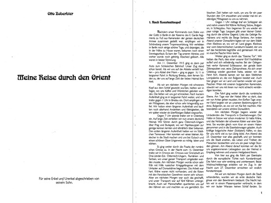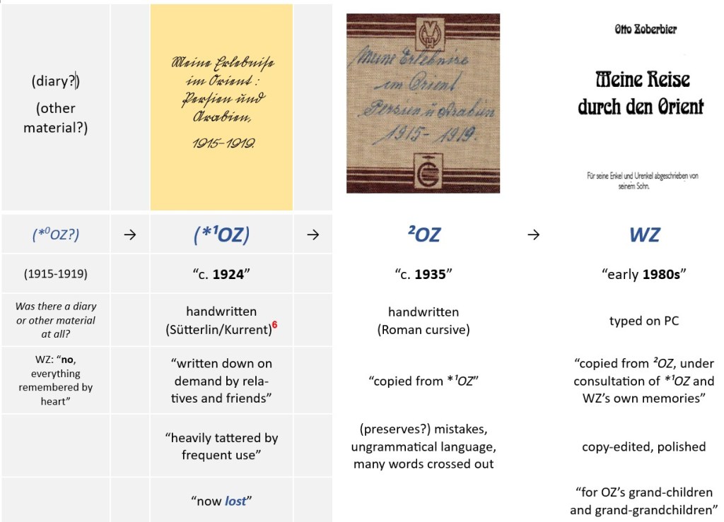 Very often, the data provided in ²OZ and WZ for dates, places, persons, prices, etc., are so detailed and precise that it is hard to conceive that Otto Zoberbier did not make use in his memoirs of some diary kept during the service or other written or printed material (letters or postcards sent home or received from there, private notes, lists, reference works, maps, etc.), material that could have helped him remember all the data with such a precision. Son Werner and grandson Manfred would nevertheless not exclude that their father/grandfather was indeed capable of producing the data with all its exactitude even years after his return from Mesopotamia. They underline that they knew him as a person who possessed a very sharp memory and that they themselves inherited this gift from him. But still, the data given in the texts are detailed to such a degree that I would dare to doubt this in spite of the relatives’ assertions. Rather, I would assume that the (alleged) first version of the memoirs, i.e., the lost *¹OZ, was compiled with the help of a diary or similar material (*0OZ).