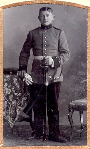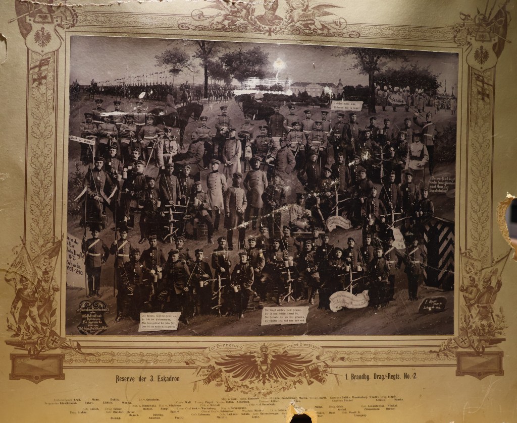 He applied to join the Schutztruppen‑ (‘Protective Troops’) Corps in German South-West Africa, but was not accepted due to insufficient height (1.57 m). Instead, he was called up to the Schwedter Dragoons, a mounted unit (also called light cavalry) [Fig. 3].