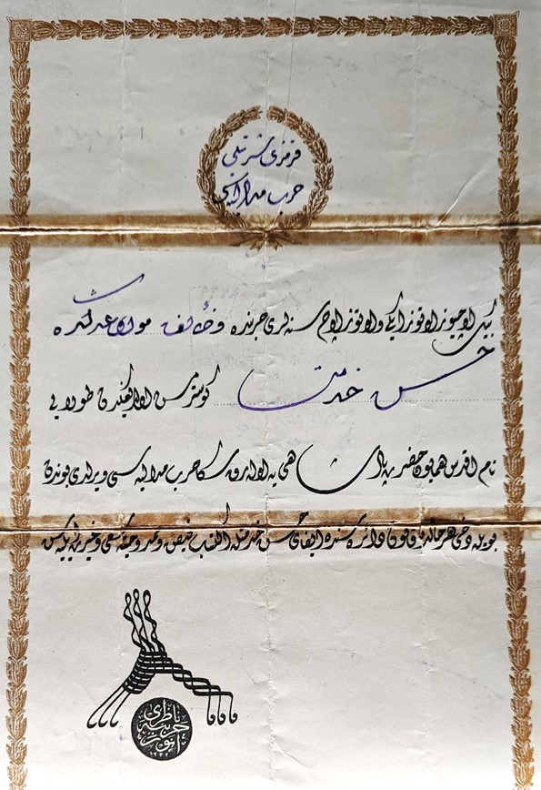 | Biñ üçyüz otuz iki ve otuz üç senĕleri ḥarbında veẓāʾif mevāḳiʿid..ñde (?) ḥüsn-i ḫidmat göstermiş oldığġıdan ṭolayı nām-i aḳdas-i hümāyūn ḥażret-i pādşāhīya olăraḳ saña ḥarb medalyăsı verildi. Bundan böyle daḫi her ḥālde (vuḳūf?) dāʾirĕsinde īfā-yi ḥüsn-i ḫidmetle iktisāb-i ḳabż … (?) saʿy ve ḫayret eyleyĕsin | On account of the good service you have demonstrated in operational functions (locations of deployment?) in the 1332-33 war you are [herewith and] in the Holy Imperial name of His Majesty the Padishah granted this war medal. From now on and in any case, you are entitled to claim (?) at, and enjoy from, the Information Ministry (?) the payment (?) for your good services. |